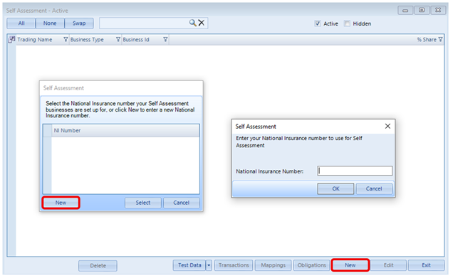To enable a new Self Assessment business, select the New option and then in NI Number New