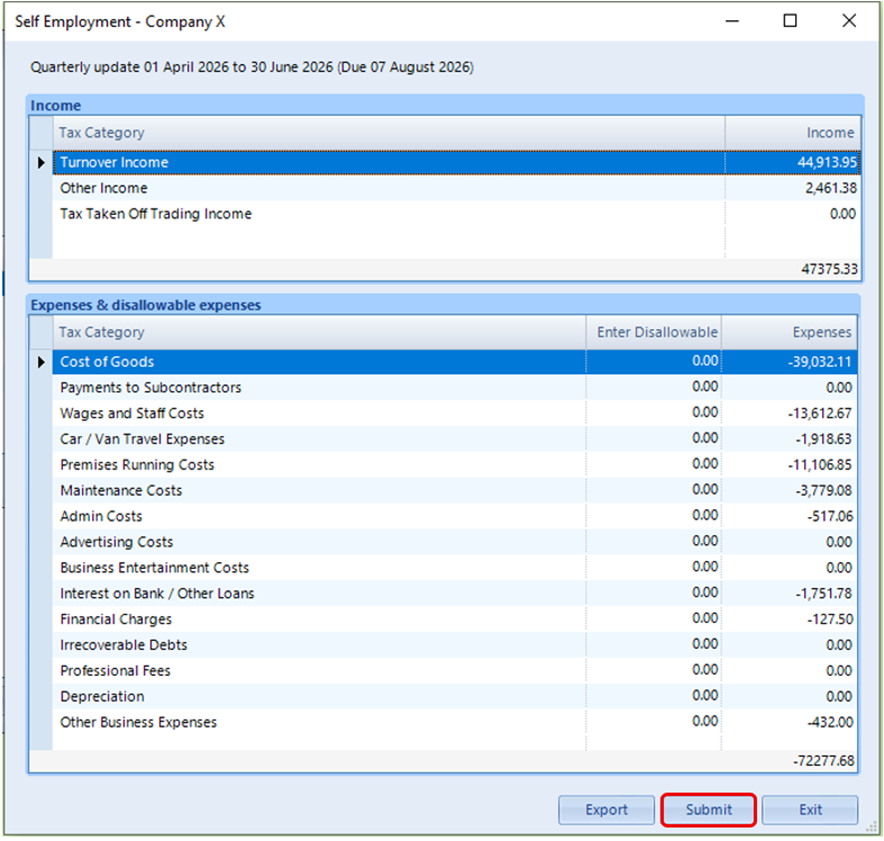 Review the income and expenditure overall amounts, as HMRC expects quarterly updates to be as accurate as possible, even though you can make corrections later in the year > Submit